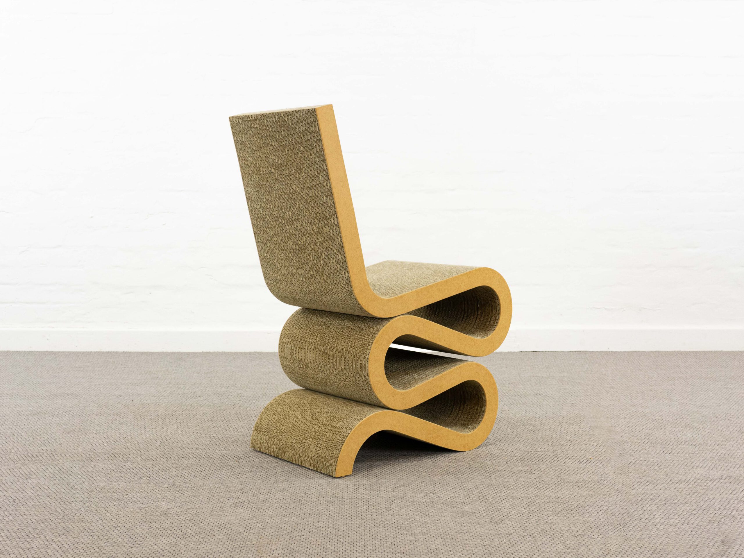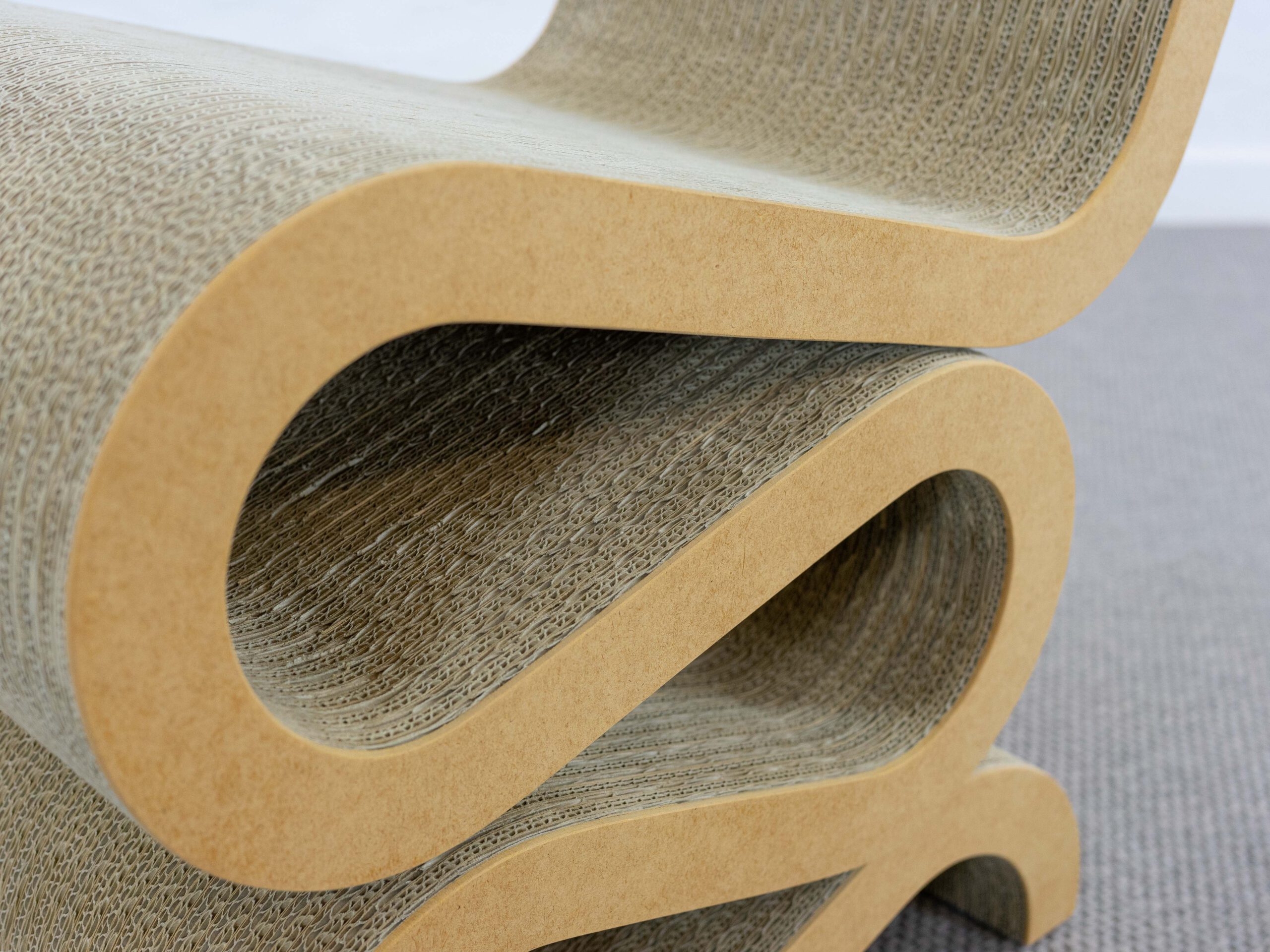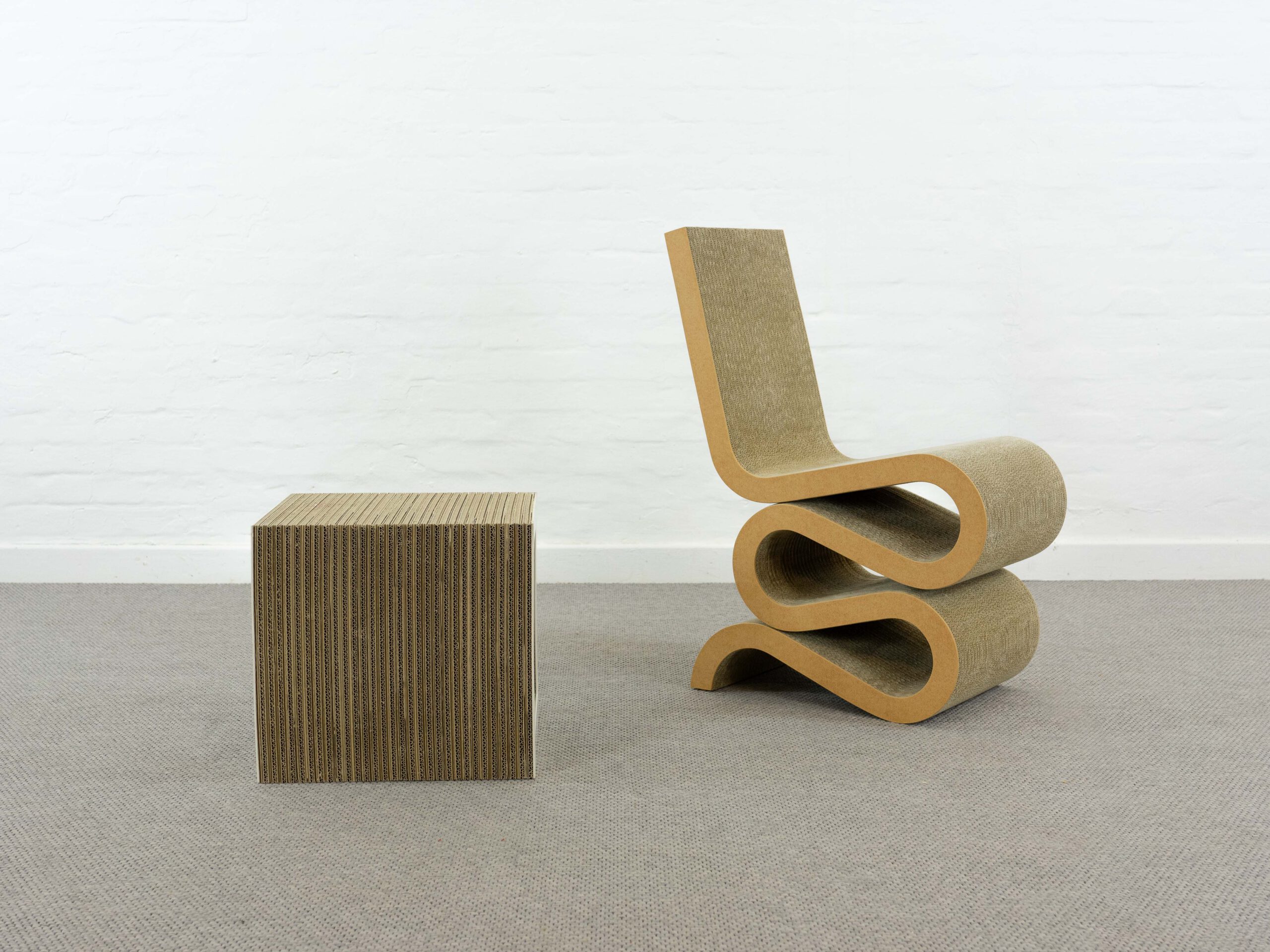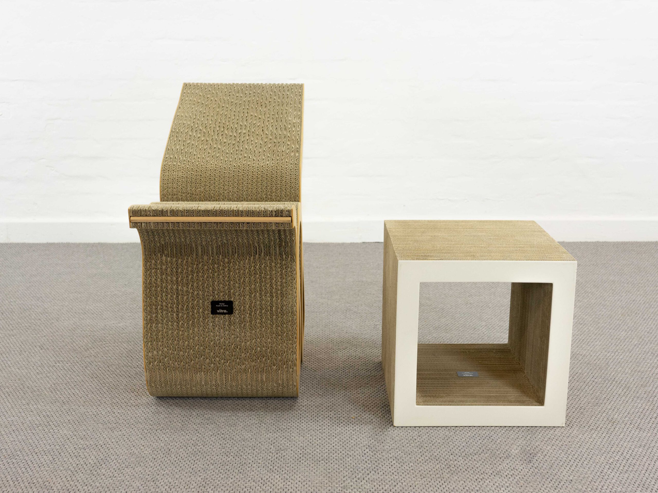 Wiggle Stuhl, entworfen vom bekannten Architekt und Pritzkerpreisträger Frank O. Gehry 1972. Die Grundidee der Easy Edges Serie, war es ein günstiges Möbel aus recyclebarem Material Wellpappe zu entwerfen. Nach wenigen Monaten wurde die Produktion zurückgezogen. Dieser Stuhl, wie auch der Tisch hier sind eine aktuelle Ausführung von Vitra. Beide Stücke mit Vitra Plakette. Ehemaliges Showroom Objekt. Der Tisch weist kleinere Macken und Gebrauchsspuren auf. 19% Mehrwertsteuer wird in der Rechnung ausgewiesen.