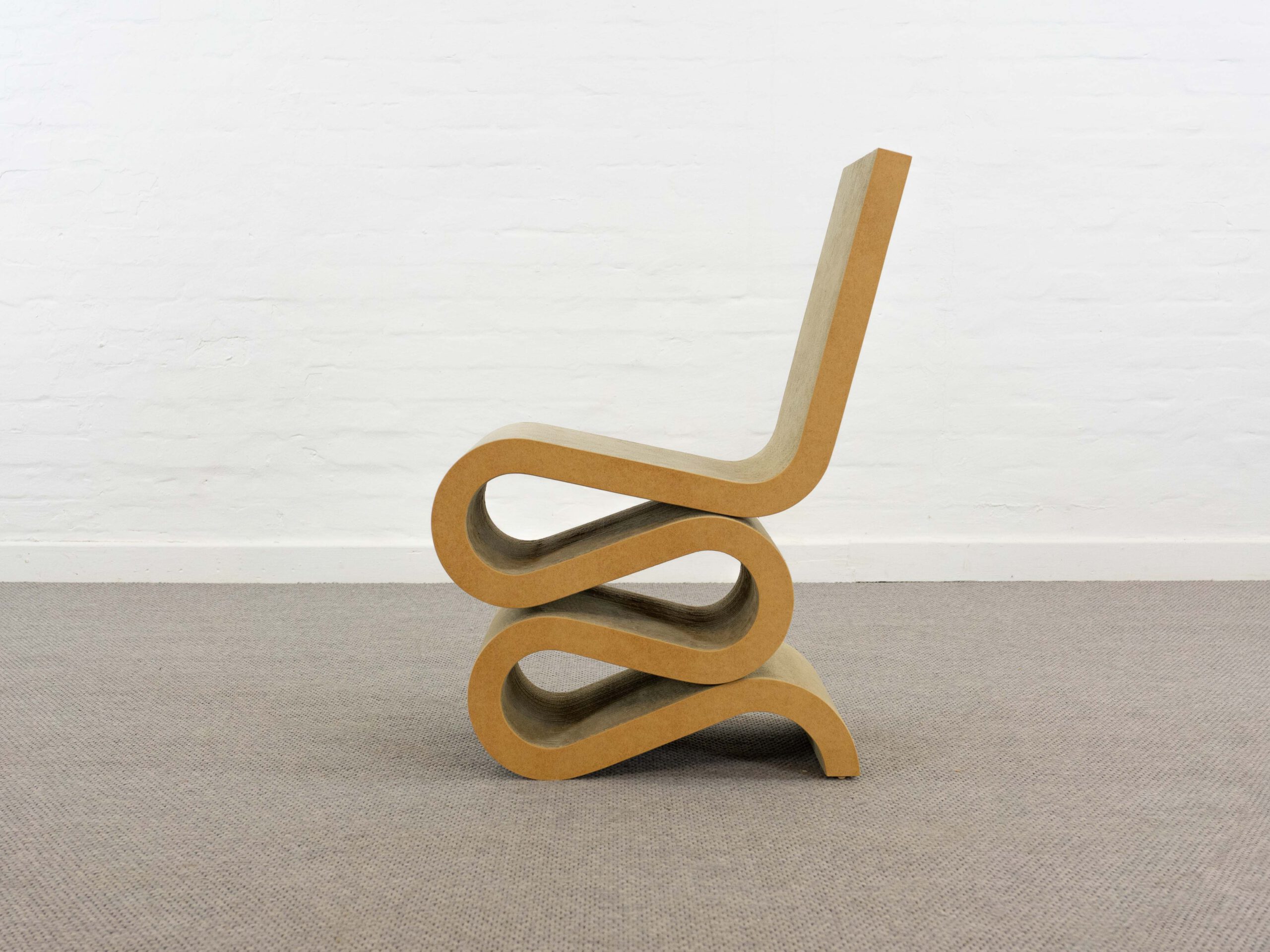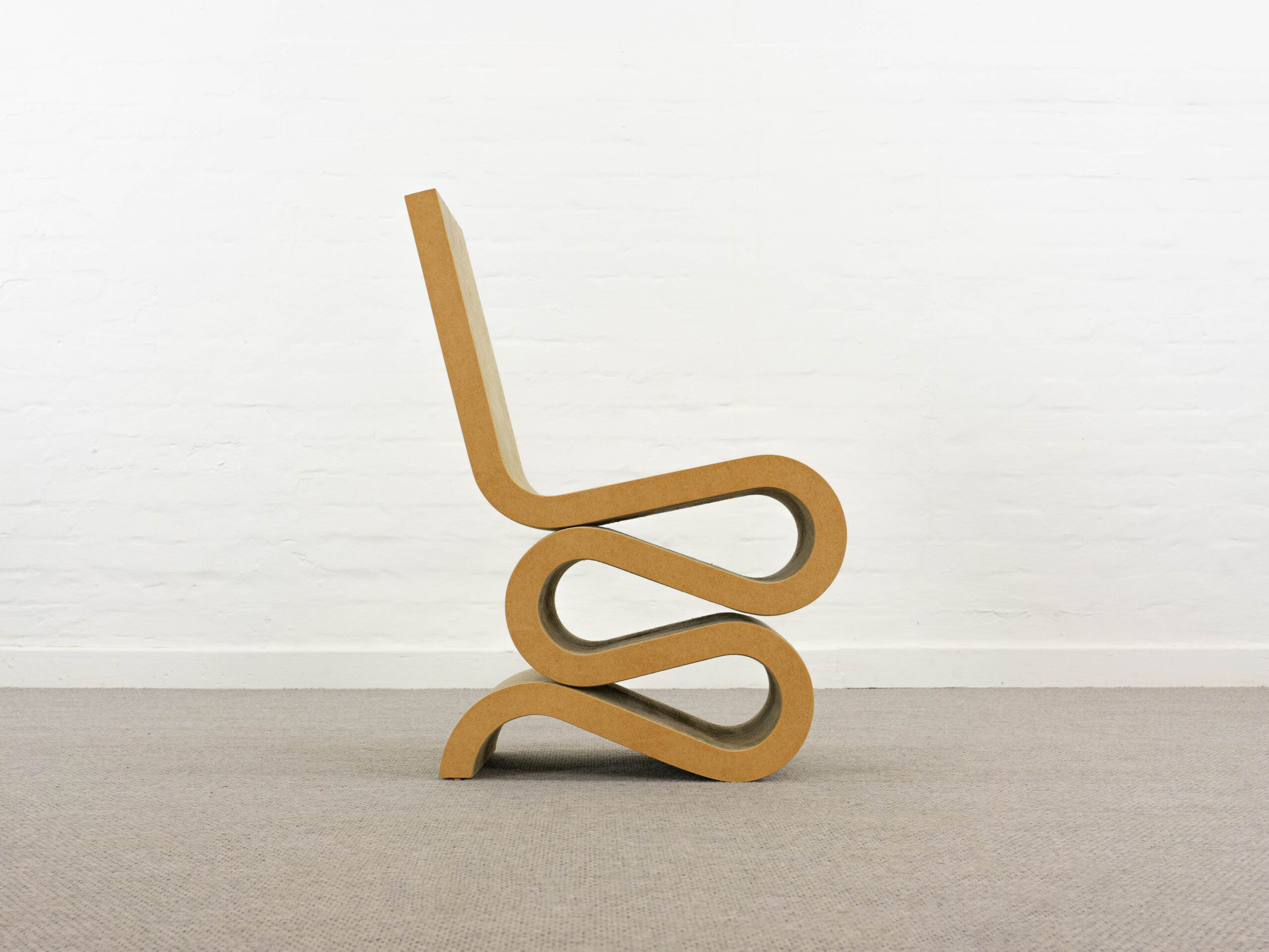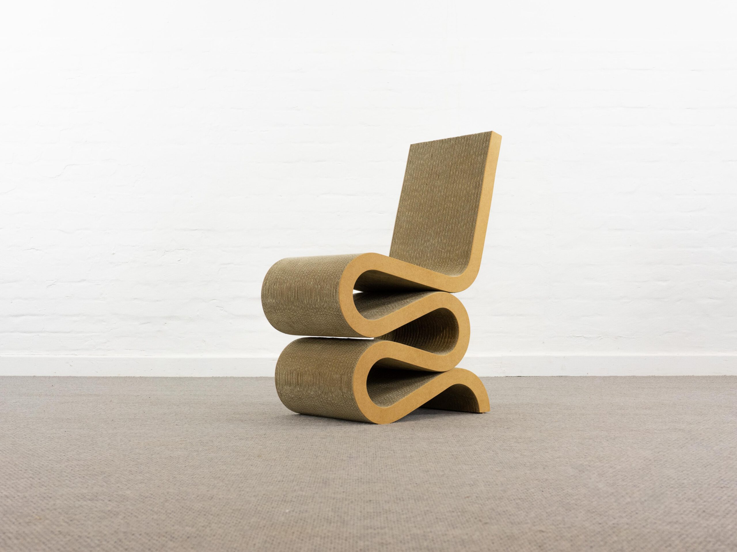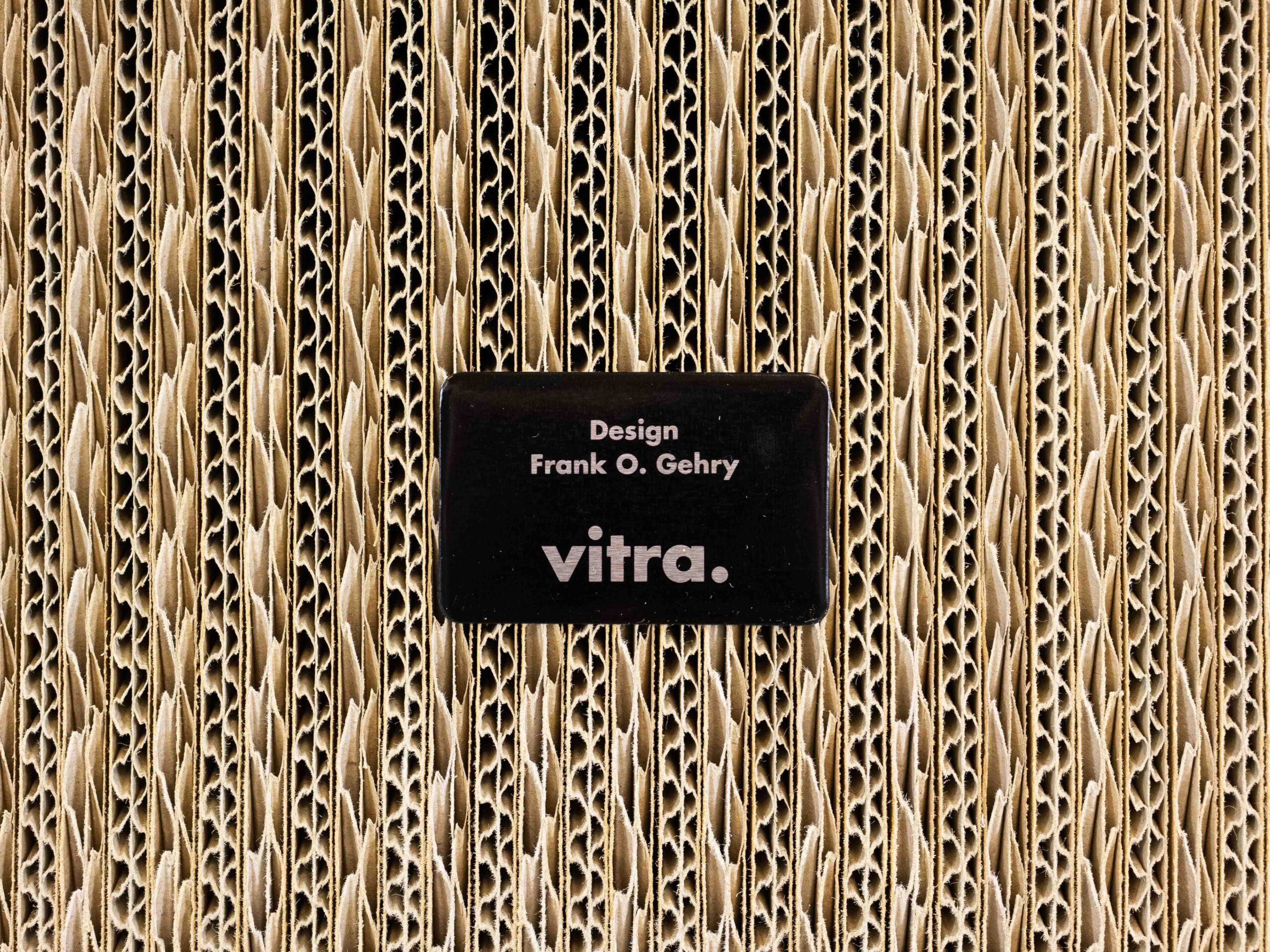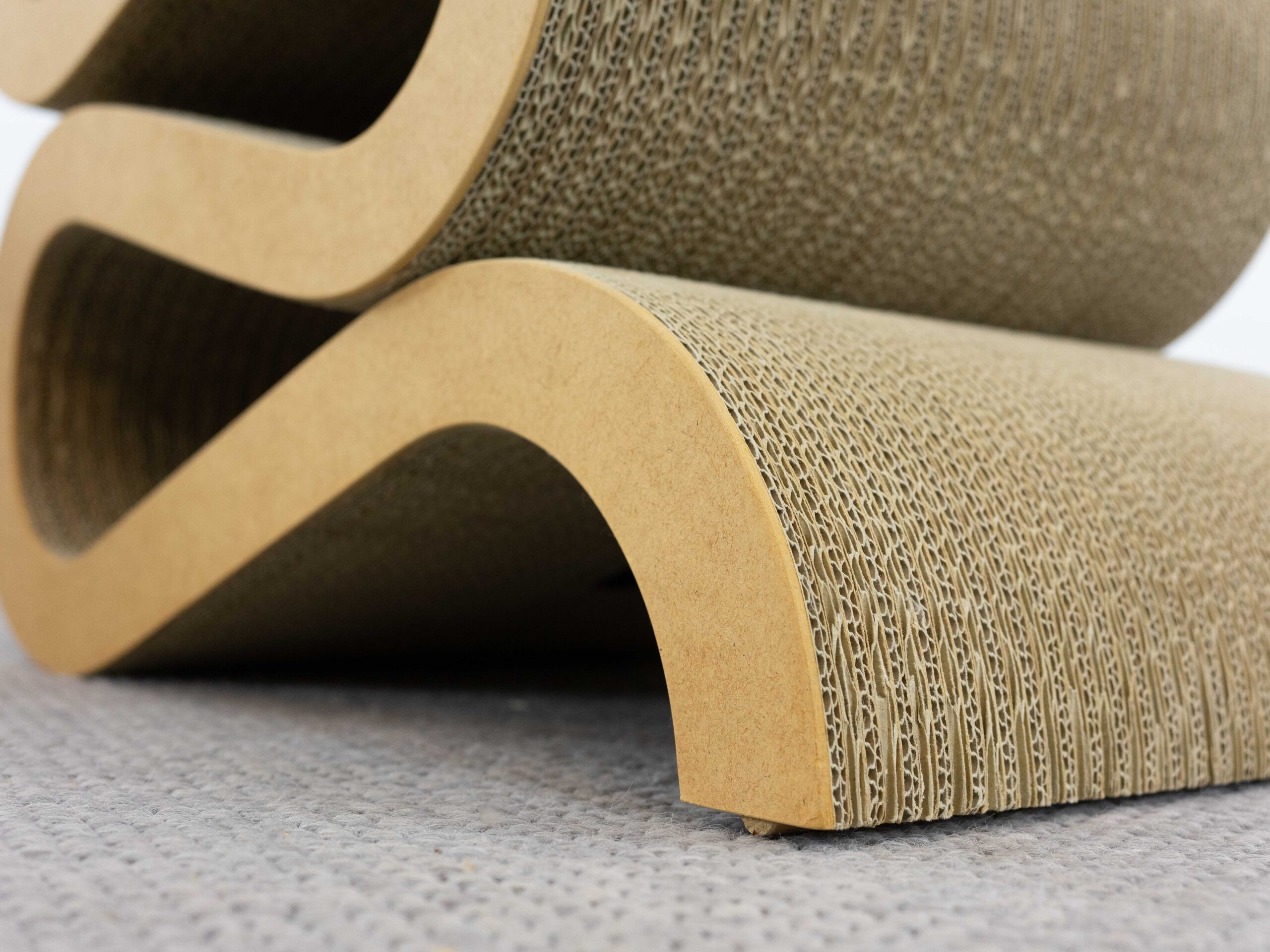 Wiggle Stuhl, entworfen vom bekannten Architekt und Pritzkerpreisträger Frank O. Gehry 1972. Die Grundidee der Easy Edges Serie, war es ein günstiges Möbel aus recyclebarem Material Wellpappe zu entwerfen. Nach wenigen Monaten wurde die Produktion zurückgezogen. Dieser Stuhl, wie auch der Tisch hier sind eine aktuelle Ausführung von Vitra. Beide Stücke mit Vitra Plakette. Ehemaliges Showroom Objekt. Der Tisch weist kleinere Macken und Gebrauchsspuren auf. 19% Mehrwertsteuer wird in der Rechnung ausgewiesen.