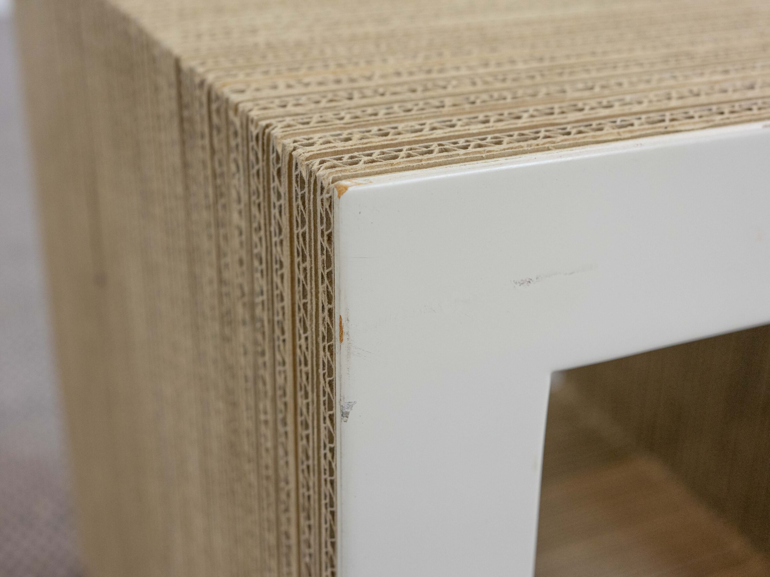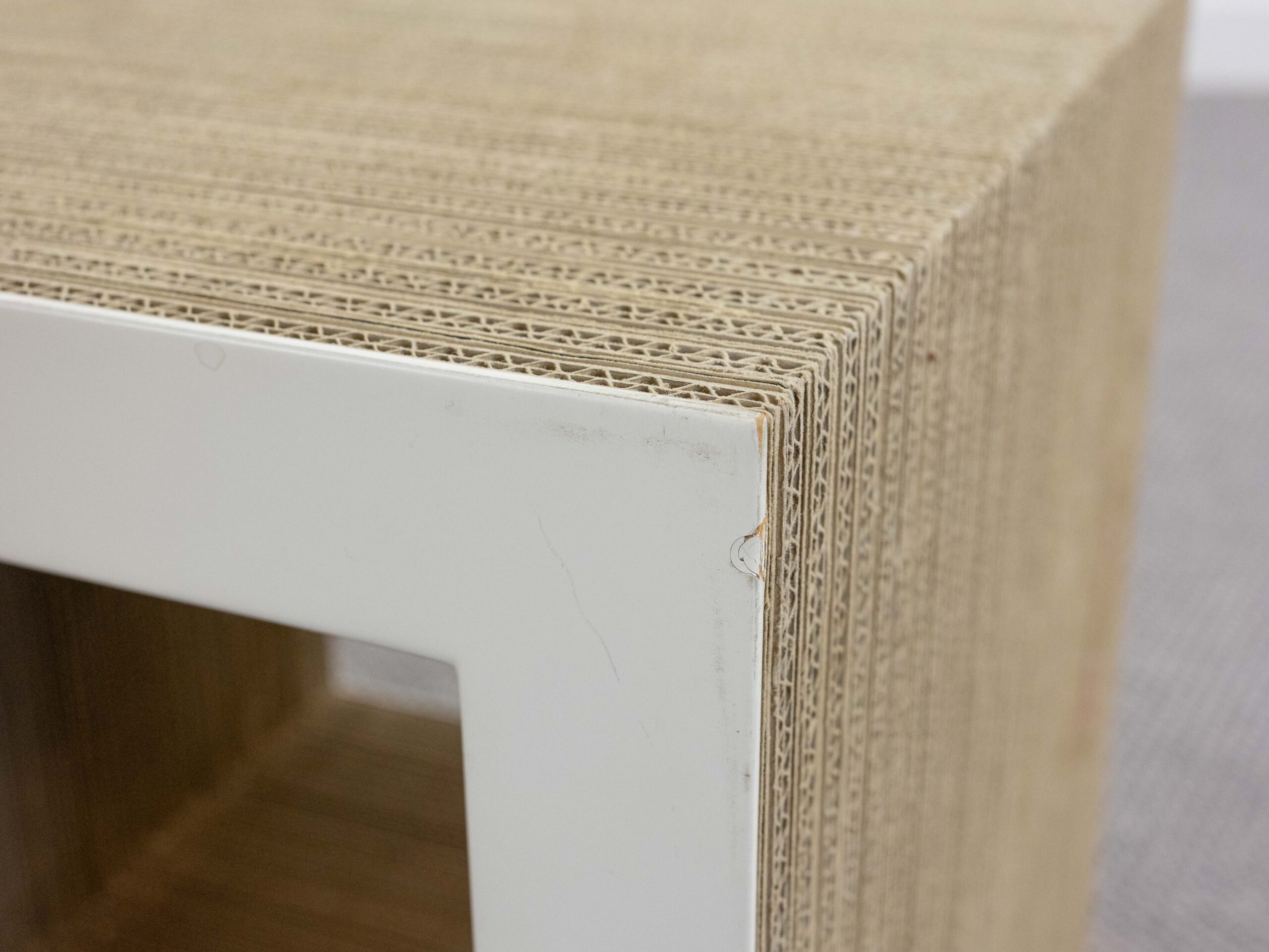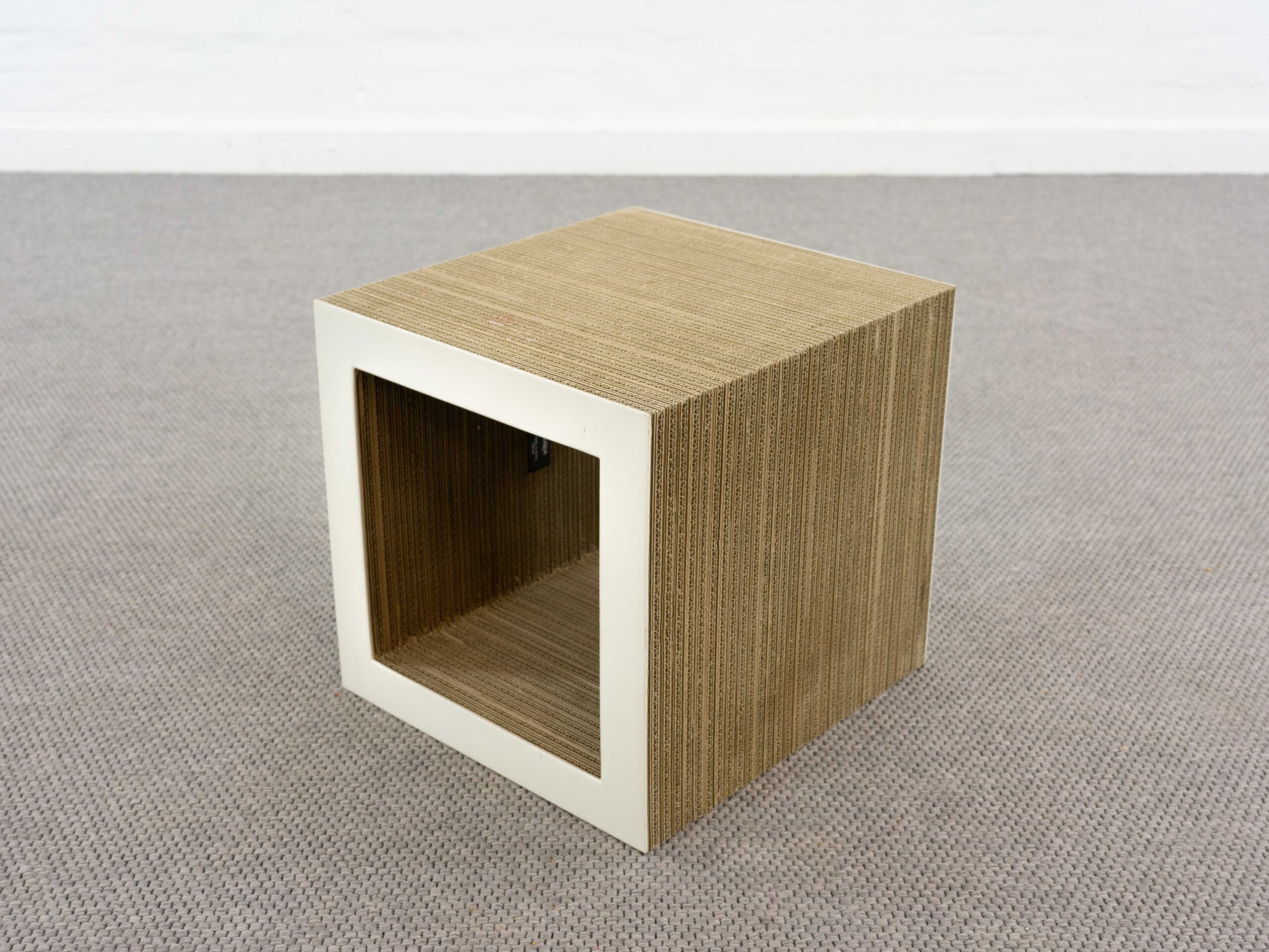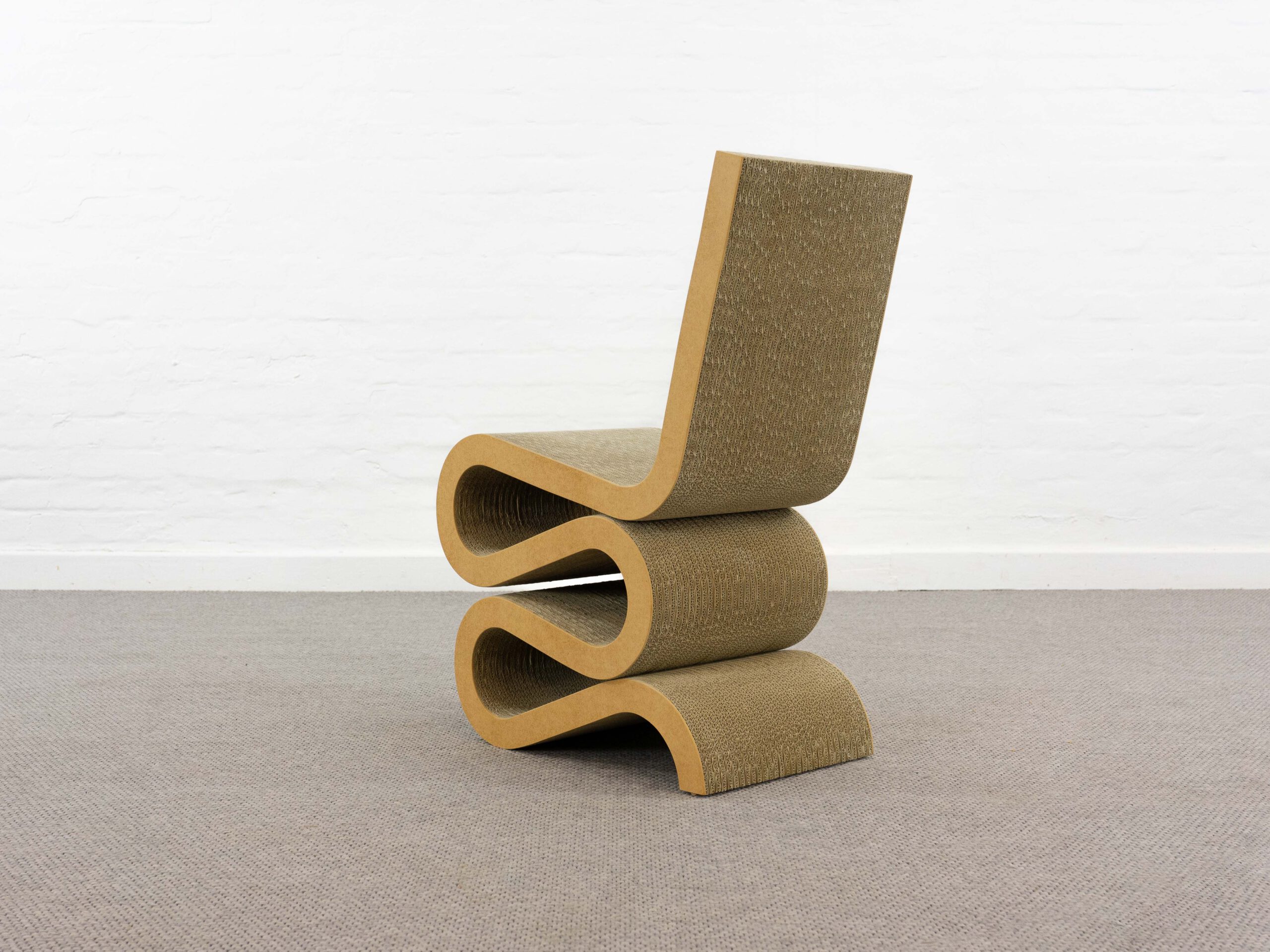 Wiggle Stuhl, entworfen vom bekannten Architekt und Pritzkerpreisträger Frank O. Gehry 1972. Die Grundidee der Easy Edges Serie, war es ein günstiges Möbel aus recyclebarem Material Wellpappe zu entwerfen. Nach wenigen Monaten wurde die Produktion zurückgezogen. Dieser Stuhl, wie auch der Tisch hier sind eine aktuelle Ausführung von Vitra. Beide Stücke mit Vitra Plakette. Ehemaliges Showroom Objekt. Der Tisch weist kleinere Macken und Gebrauchsspuren auf. 19% Mehrwertsteuer wird in der Rechnung ausgewiesen.
