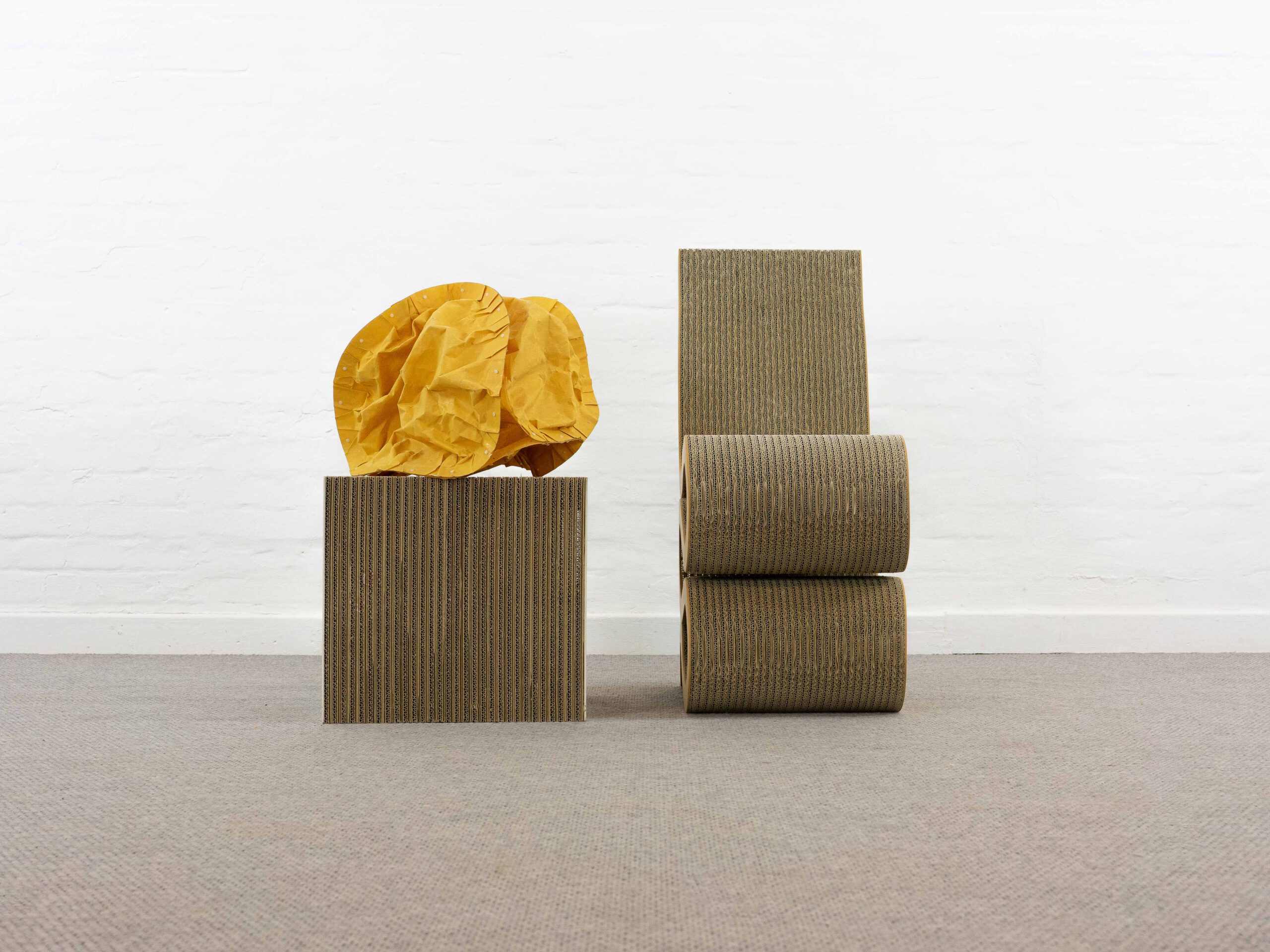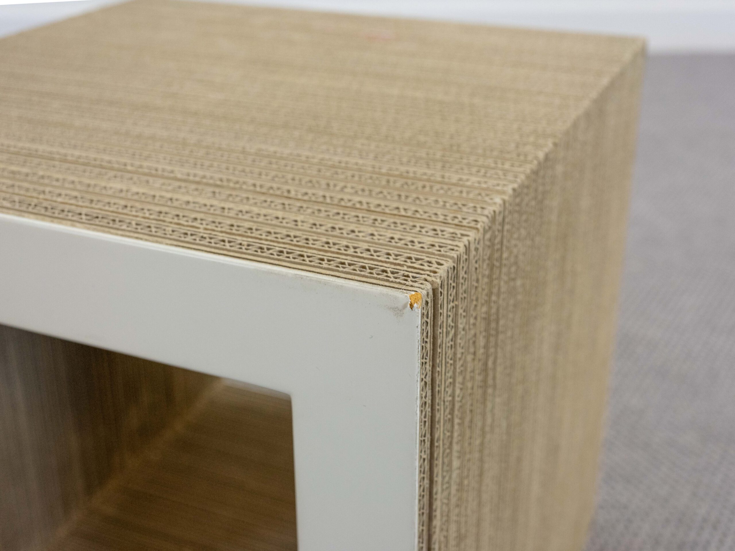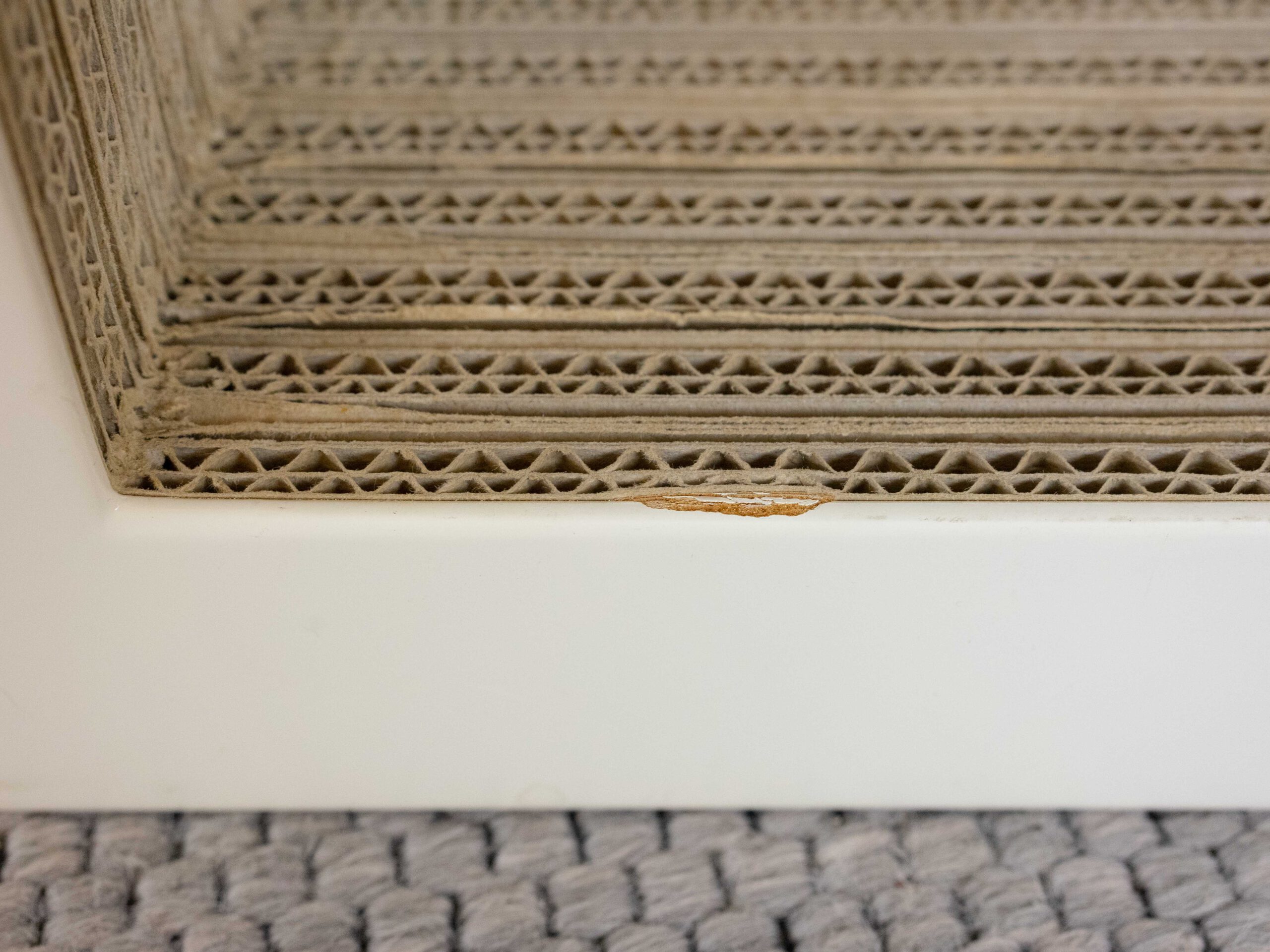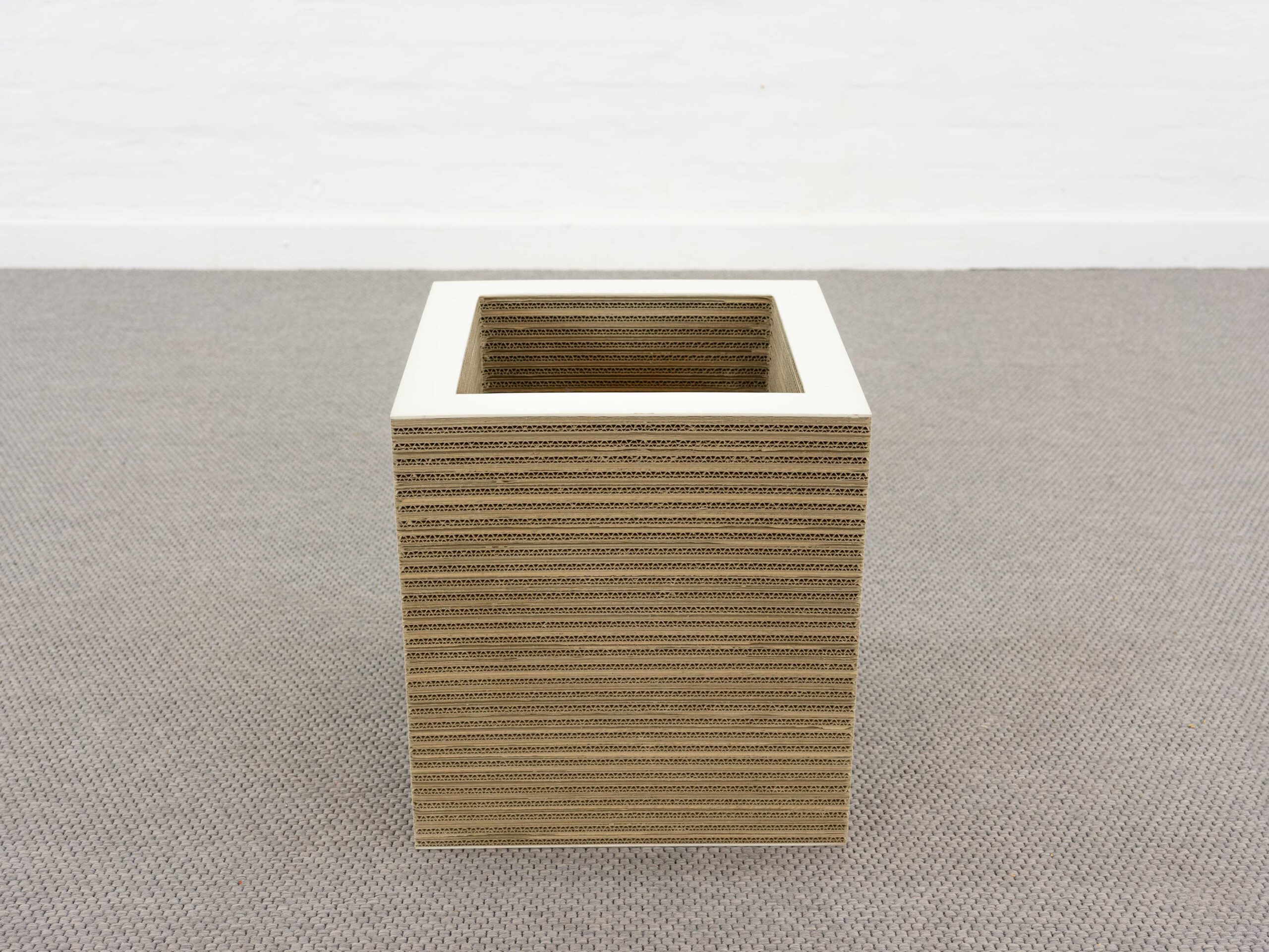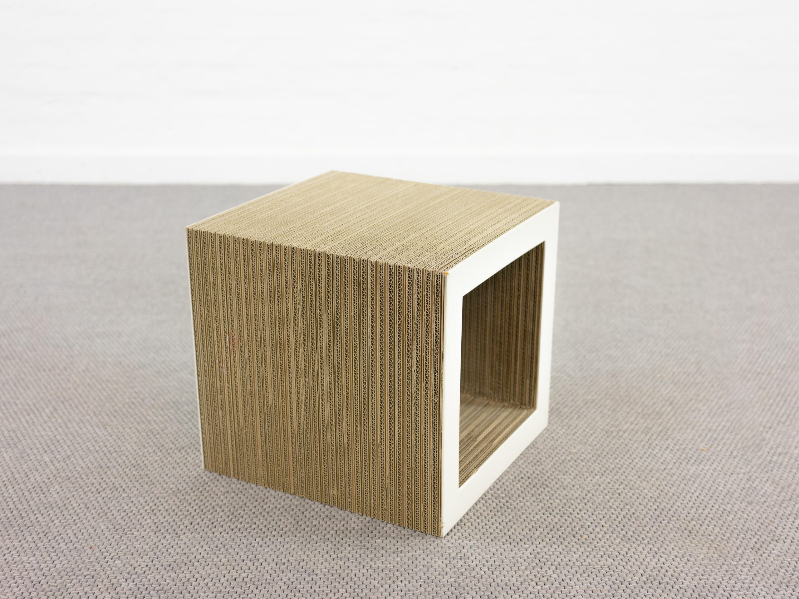 Wiggle Stuhl, entworfen vom bekannten Architekt und Pritzkerpreisträger Frank O. Gehry 1972. Die Grundidee der Easy Edges Serie, war es ein günstiges Möbel aus recyclebarem Material Wellpappe zu entwerfen. Nach wenigen Monaten wurde die Produktion zurückgezogen. Dieser Stuhl, wie auch der Tisch hier sind eine aktuelle Ausführung von Vitra. Beide Stücke mit Vitra Plakette. Ehemaliges Showroom Objekt. Der Tisch weist kleinere Macken und Gebrauchsspuren auf. 19% Mehrwertsteuer wird in der Rechnung ausgewiesen.